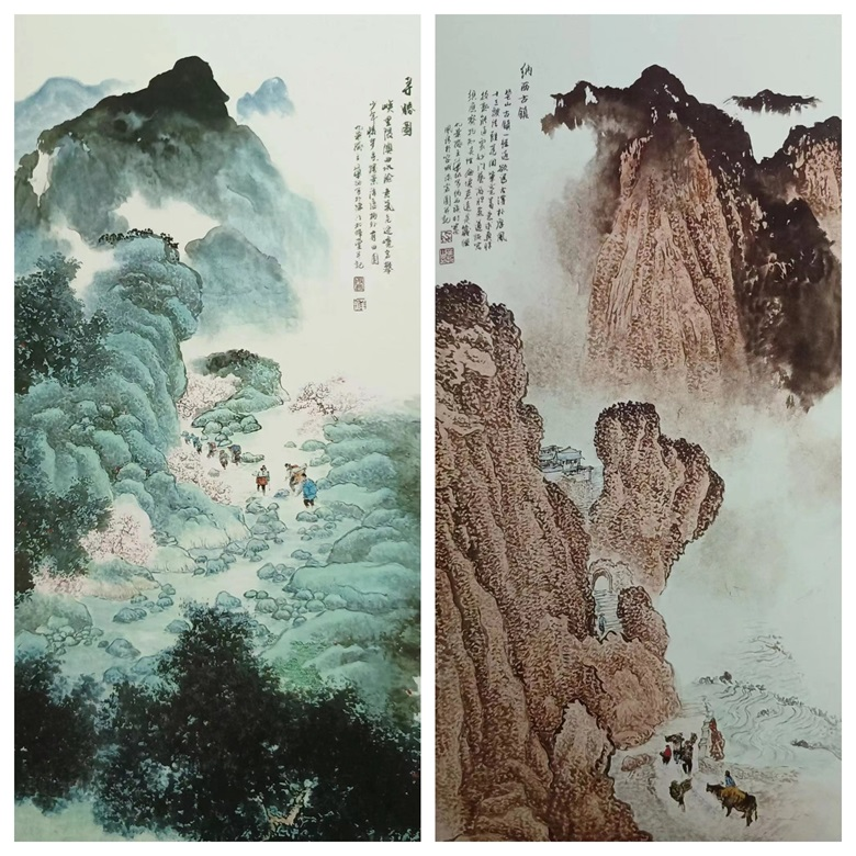 一定是版画出身的华拓血脉中始终沁润着版画的风神,当情感与精力投入于青绿山水时,他自然而然地把版画的精彩汇聚于重彩之中,尤其把黑白的对比方法嫁接于多色、多彩的对比,更显得色彩浑成、恰到好处。从一开始进入国画到倾情国画再到近几十年游刃于青绿山水,华拓因对黑白的敏感表现于青绿山水而得心应手,他善于把版画的黑白关系变通于青绿山水的色温、色调、色差的对比。比如在物象结构、明暗对比、空间层次,以及质感体量等艺术表达方面,他以形、光、色、线的塑形能力,通过灵活而自由地调和大色块之间的微妙变化,进行快面分割,增强某一色相面积、某一明度面积或某一纯度面积来主导画面,让大色块与整体色调融成精妙,形成韵律和节奏,使大色块在的整体氛围之中,既充盈着强烈的视觉力量,又若隐若现,乍合乍离,给观众一种清新明朗,而又充满生机的意境,而且,随境敷彩、随类赋彩,画面或变幻的、或温润的、或浑厚的、或鲜明的、或柔和的、或细腻的……,观者因色彩的变幻而心境升腾,流连忘返。