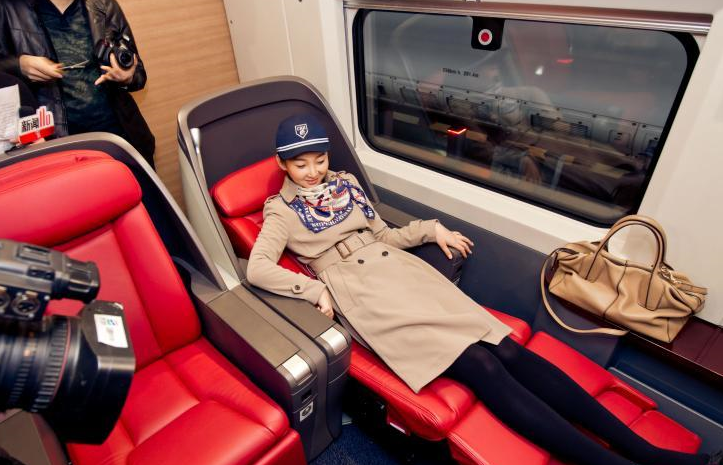 3月25日,首批CRH380A型高速动车组亮相福州南动车所,豪华商务舱格外抢眼。据了解,CRH380A型高速动车组车厢两头各有一个商务舱,座椅全部采用真皮材质,座椅下设有抬升腿部软垫,乘客可将座椅调整成水平180度。此外,座椅旁还配备有影视娱乐系统,里面有包括音乐、电影在内的多个专门频道供旅客选择。李南轩 摄