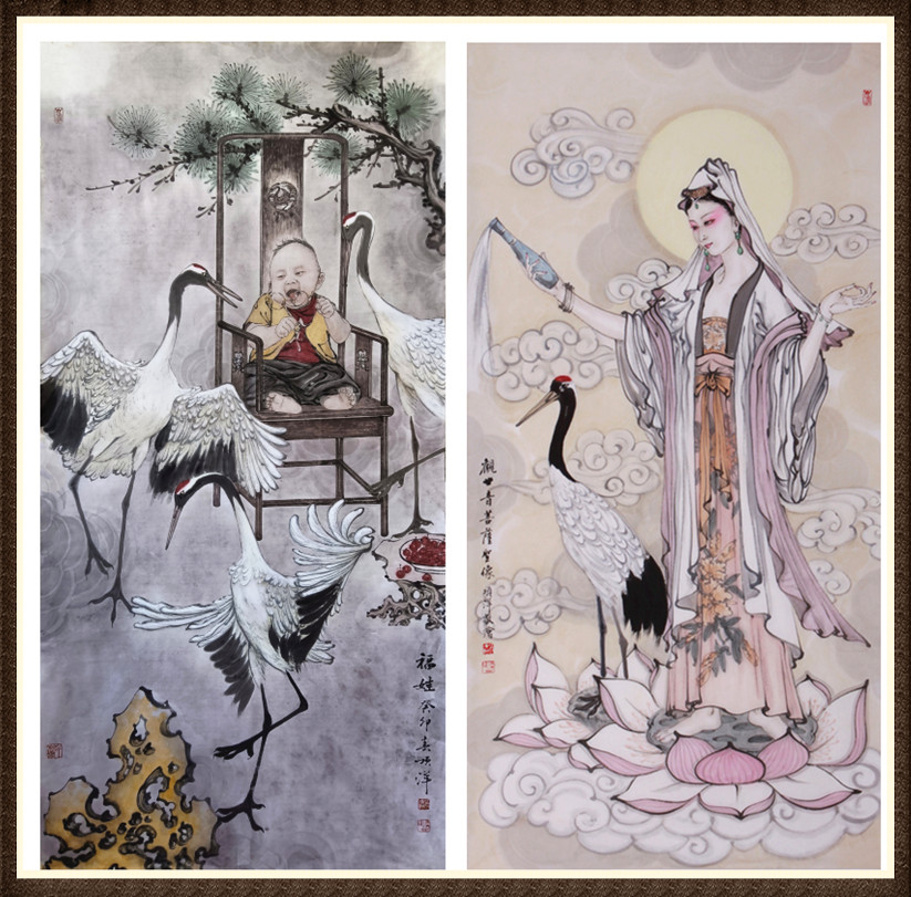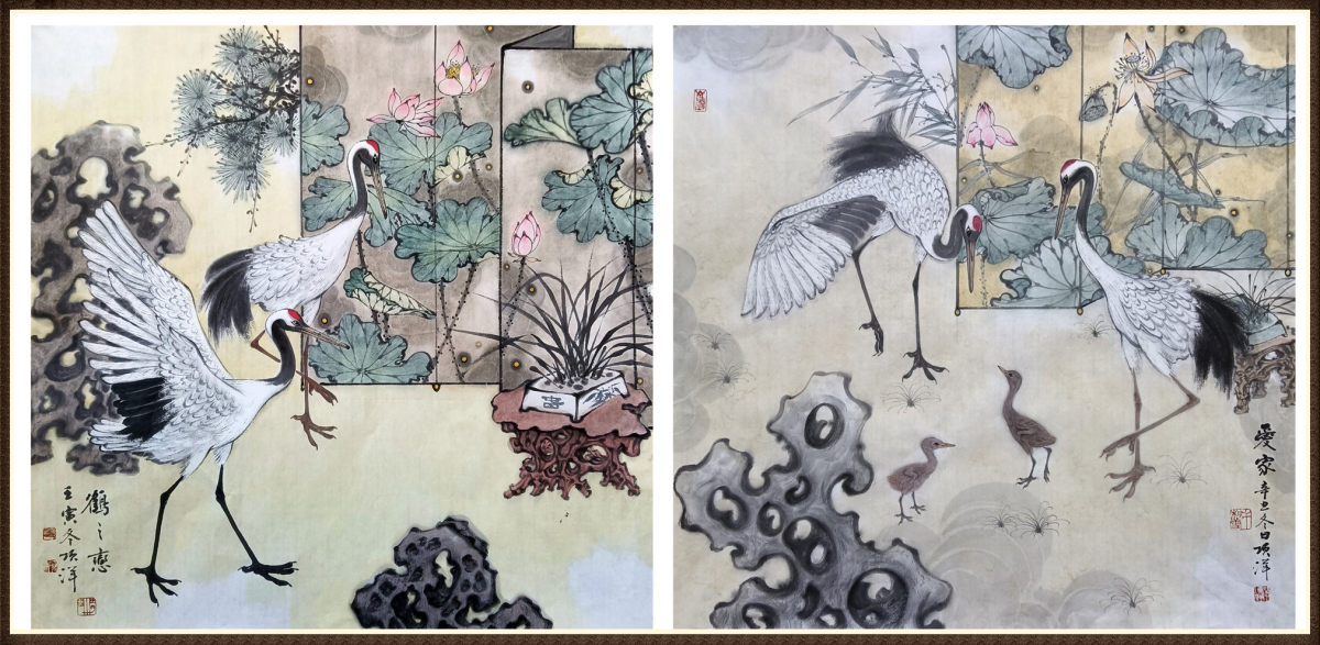 意蕴,审美的意蕴。严项洋认为,“写意是一种亦真亦幻、亦明亦暗、亦虚亦实的绘画语言,是一种境界,是法亦无定法,或行于画内,或游于画外,虽形于技法,却乃心境之物,若仅得形于手,周旋于技法左右,则难以得其真谛。”基于此,他始终追求的是“融入形式与内容、笔墨与意蕴、法度与情感的完美一致,建立一个全新的、完全属于自己的绘画形式。”他不仅是这一理念积极的倡导者,而且也是坚定的践行者。或许是因为故乡是鹤乡的缘故,严项洋的笔下常有表现不同人物与丹顶鹤的作品,如《鹤之恋》《鹤之歌》《清风图》《鹤趣图》《鹤羽清风》《松鹤长春》《童子闹春》《古松苍苍》《风来花自舞》等等,如果算上丹顶鹤系列,可以开出长长的作品清单来,足见作者与这方面题材的结缘之深和用情之重。就作品的意象看,我于其中感到十分突出的又有一种气贯串之中,如同中国古代许多学问都讲“气”一样,哲学讲“气”,中医讲“气”,文艺也讲“气”,我以为这里的“气”究竟是精神的还是物质的或许很难说,但它的基本特征应该是一种诉诸感知的生命力量。故艺术家胸中有气场 、笔下有气度、作品有气象。严项洋画鹤,尽管每幅画的主题各有侧重,但共同的特征一是空间的完整性,以彩墨的明快替代传统水墨的沉稳,从而给人以较强的空间纵深感;二是色彩的鲜明性。他对色彩的认识相当解放,放手运用对比色,画面中无论是红与绿、黄与蓝,还是橙与紫、黑与白,对比鲜明,单纯强烈,有效地提升了色彩的对比度,增强了画面的吸引力;三是关系的互动性。画面中的一草一木、一花一果、一动一静,哪怕是人物手中的折扇、身下的座椅,或者是桌上的水果、身边的屏风,都是画中人与物互相呼应的情感表现。特别是他笔下的鹤,不管是在什么背景下还是在不同环境里,都从形态上带给人一种动感,这是鹤与鹤、鹤与人、鹤与环境之间的互动。从而让画中的静物达到了另一种实际效果——杯子从来不只是一个杯子,苹果也不只是一颗苹果,而是成为人物身份地位和知识个性的象征,实现了静物画中的静物不静。这样的艺术表现手法,让我们普通观赏者在欣赏画作时,也能从悦耳悦目、悦心悦意、悦志悦神的角度,逐渐进入审美的不同层次。