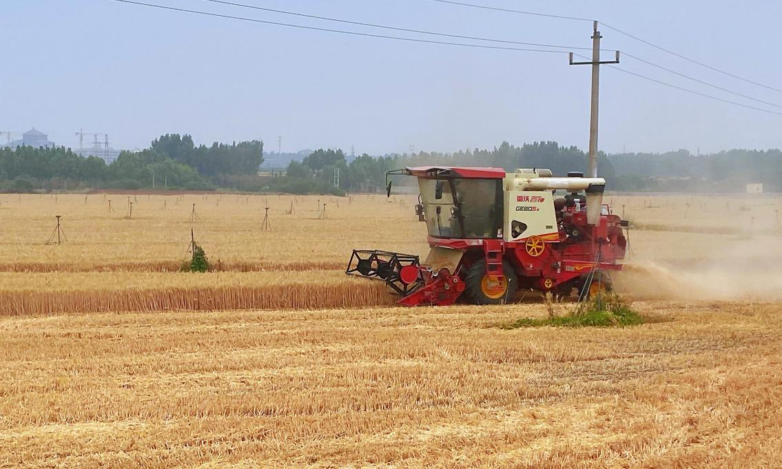 图为6月5日河北省邯郸市磁县西来村农机手驾驶联合收割机收割小麦