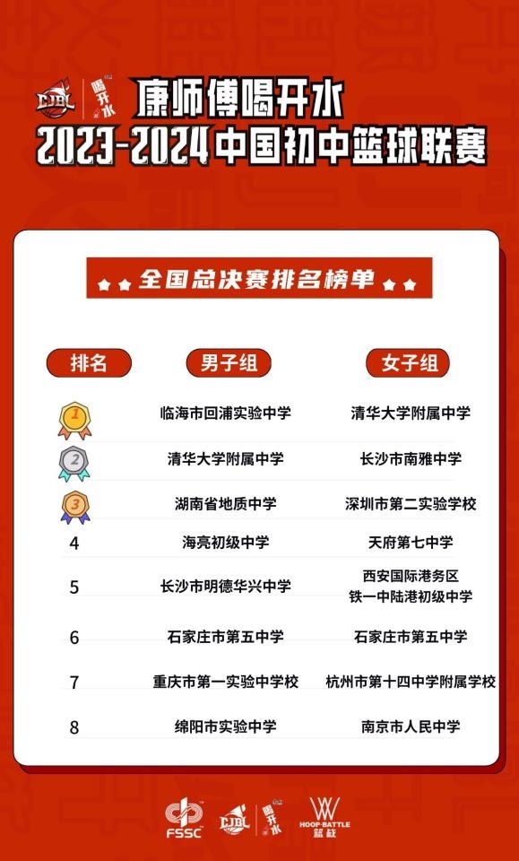8月18日,康师傅喝开水2023-2024中国初中篮球联赛全国总决赛圆满落幕!恭喜临海市回浦实验中学、清华大学附属中学分别获得男子组、女子组冠军。