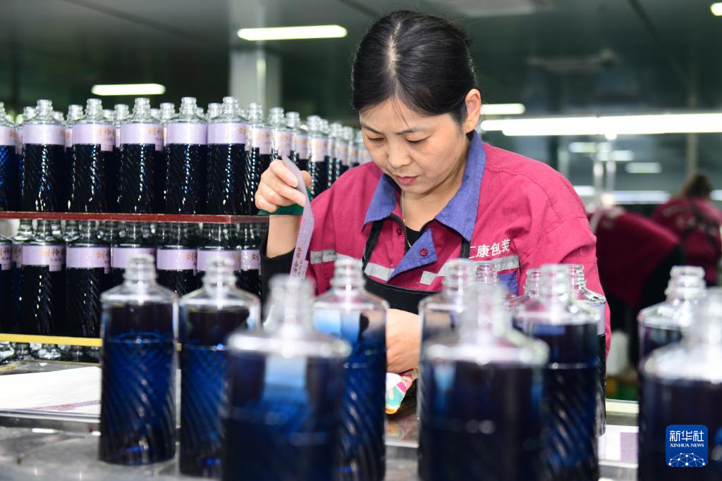11月27日,在郓城县丁里长街道烟郓科技产业园,工作人员为酒瓶贴花。