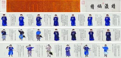 乾隆帝《御笔平定台湾二十功臣像赞》全长1060.5厘米,著录于《秘殿珠林石渠宝笈汇编·续编》。1787至1788年,皇帝命福康安率兵平定台湾林爽文、庄大田叛乱后,亲自撰文总结,并绘制功臣像,考绩评赞,以表彰其功勋。