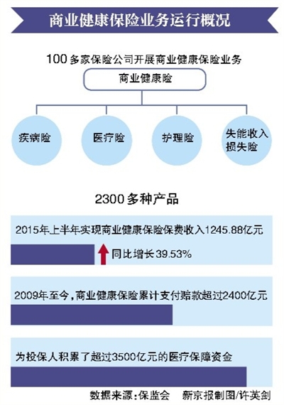 保监会公布的数据显示,2015年上半年实现商业健康保险保费收入1245.88亿元,同比增长39.53%。2009年至今,商业健康保险累计支付赔款超过2400亿元,为投保人积累了超过3500亿元的医疗保障资金。