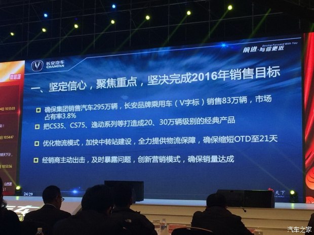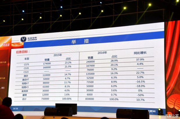 早在2016年初,长安汽车就高调对外宣布了本年度发展目标。长安汽车总裁朱华荣说:“2016年,长安汽车向更高的目标迈进。长安品牌乘用车计划销售116万辆,同比增长15.2%。其中,长安品牌乘用车2016年的销量目标为83万辆,同比2015年增长10.6%。”