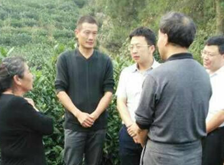 时任安化县县委副书记谢君毅(左三)、安化制茶大师龚菊香(左一)带领各级领导莅临新老基地指导工作,刘中军(左二)陪同参观。