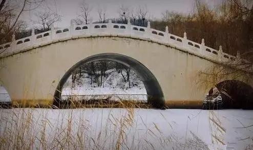 玉佛寺四季不同,有着截然不同的风情。正门前的目光总是被先被位于玉佛寺北侧的玉带桥吸引。通体白色的复拱式仿古三孔桥,造型流畅、柔和、匀称,远观宛如一条美丽的玉带,因此称玉带桥。冬天玉带桥下湖水冰雪覆盖,残阳白雪芦苇丛丛如同水墨写意画泼洒。